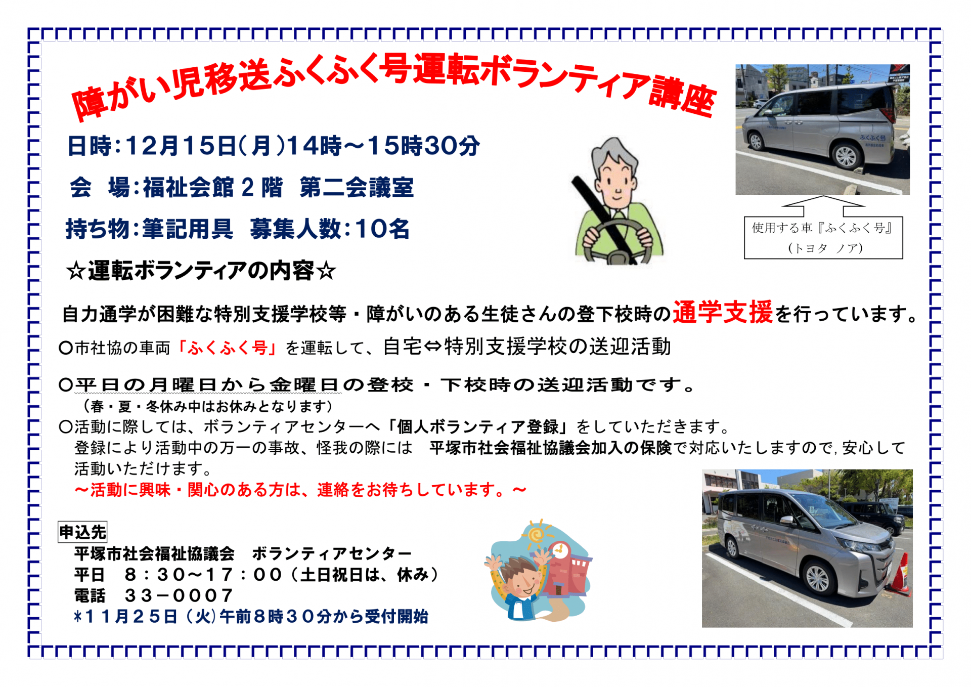 様々な事情があり、ご家族で通学支援が困難な障がい児を市内の支援学校等へ市社協の車両(ふくふく号)で通学支援を行うための運転ボランティアを養成します。